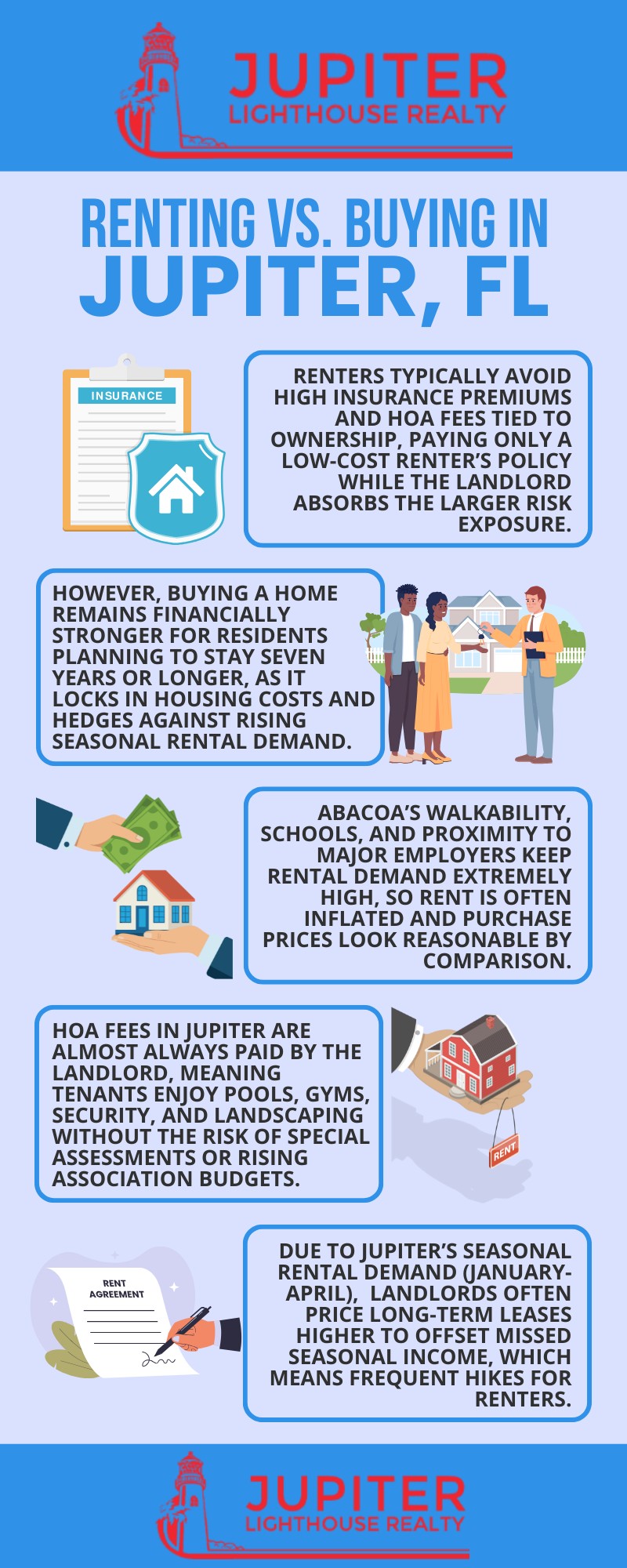 In 2026, renting in Jupiter is usually cheaper month-to-month due to high insurance premiums and HOA fees tied to ownership.